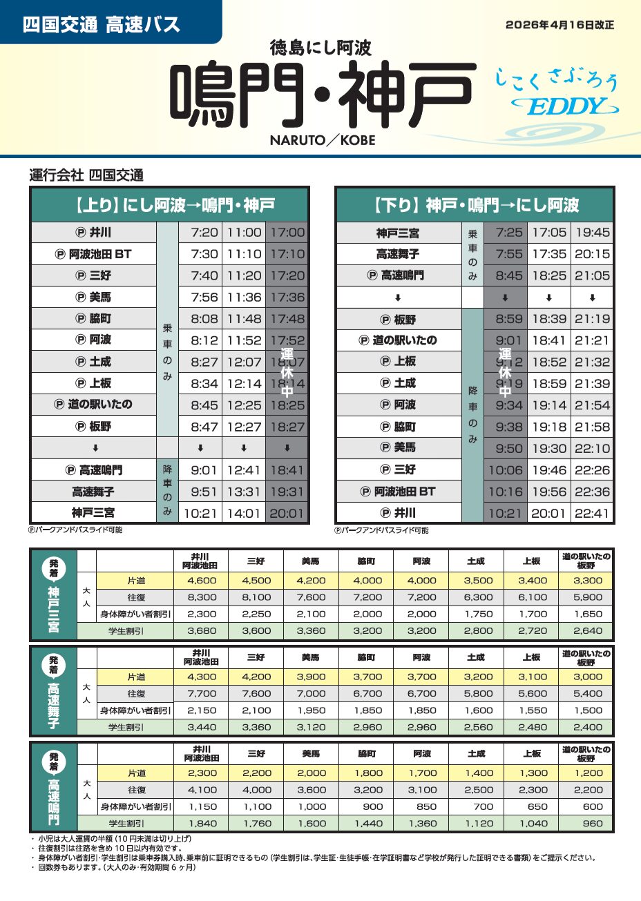 | 阿波池田バスターミナル | 4,300 | 7,700 | 15,400 | 3,440 | 2,150 | 3,850 |